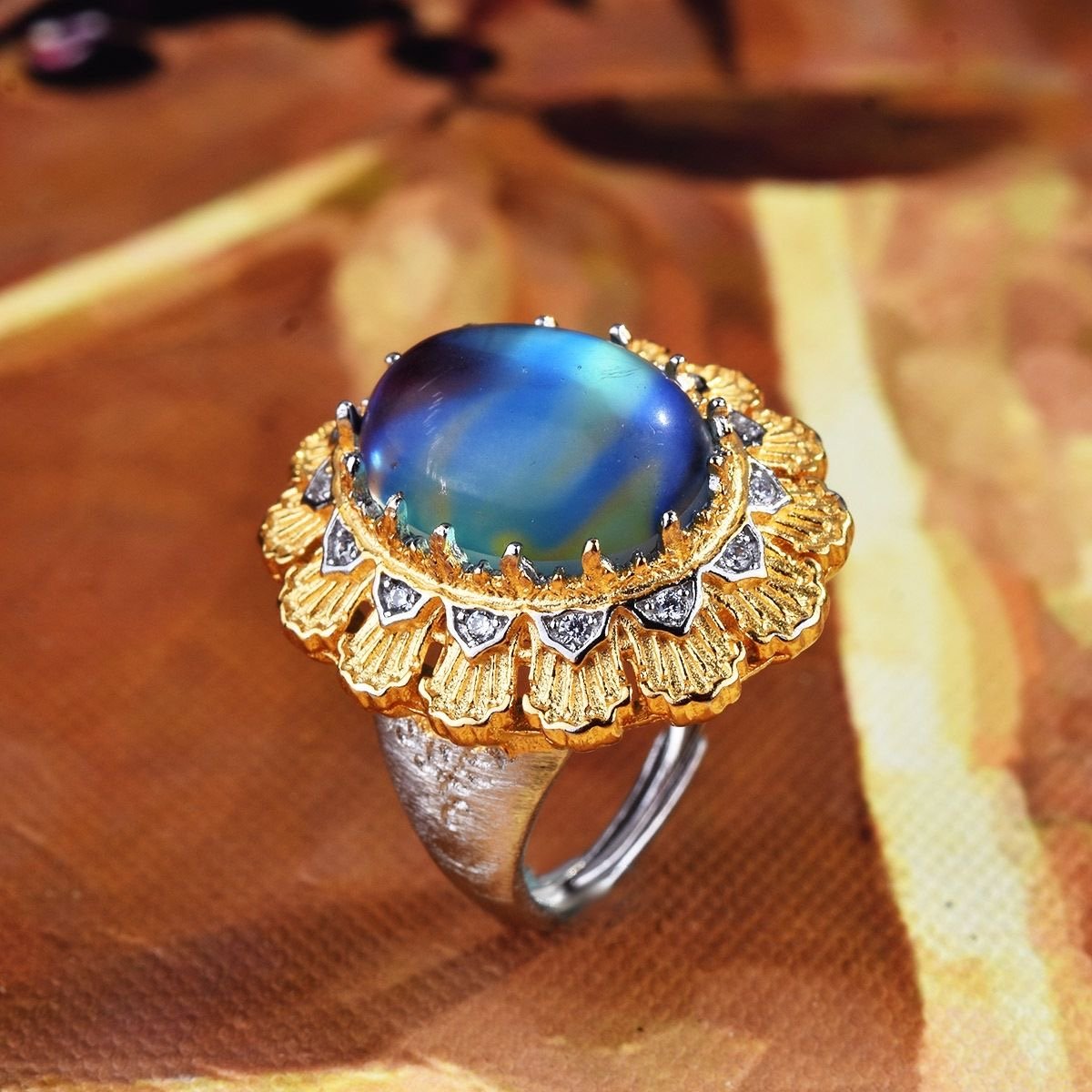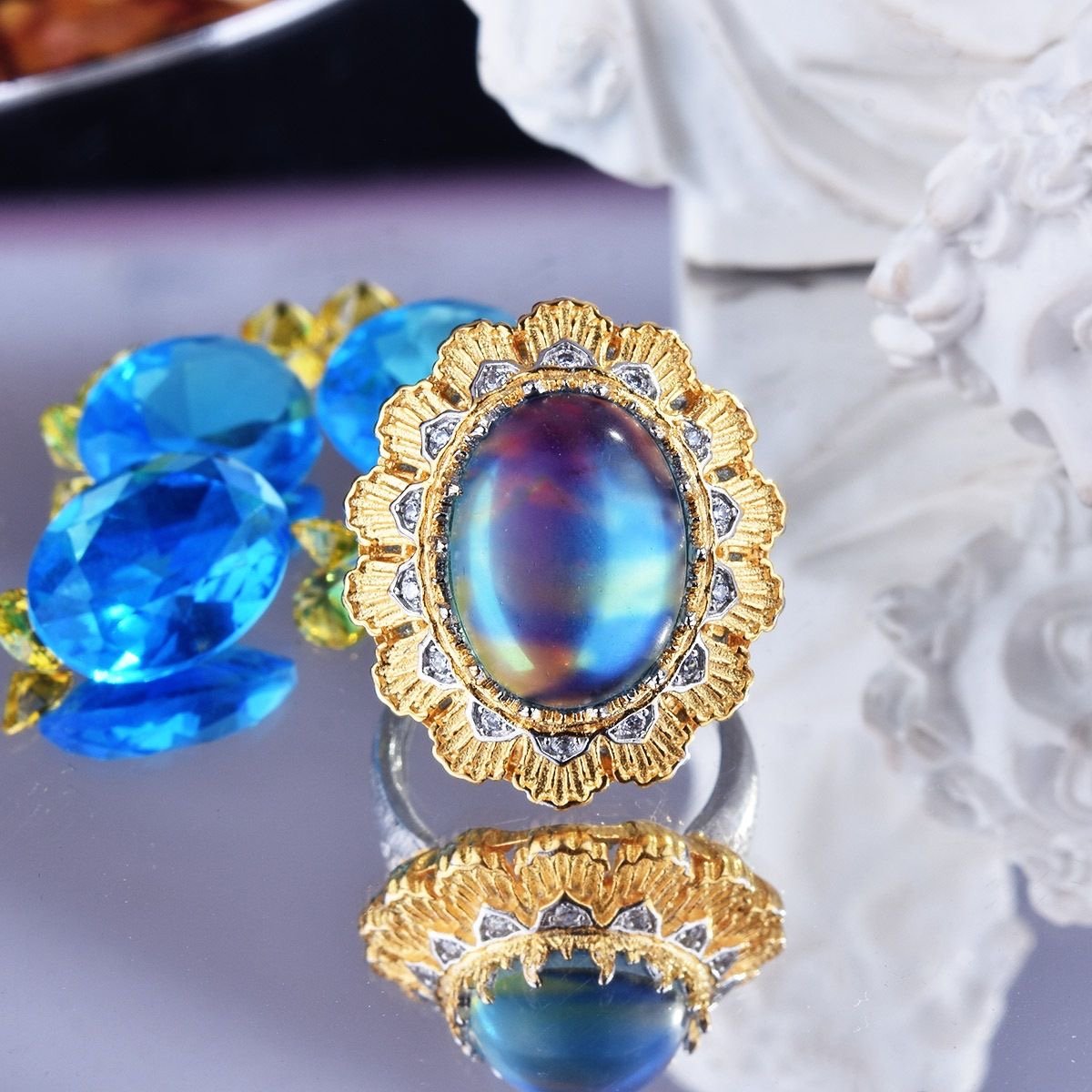 Carved gold hand-drawn moonstone French antique two-color gold lace ring